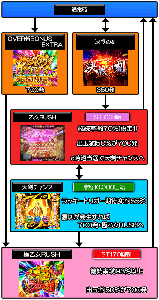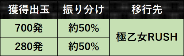 滞在中の大当り後は再び極乙女RUSHへ突入する仕様で、継続率は約93%以上。また、大当り時は約50%が700発獲得可能な10R大当りとなっている。