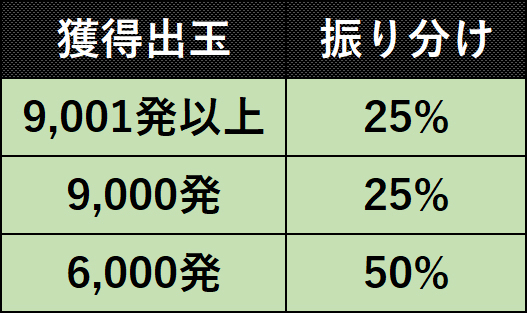 6,000発以上獲得可能な大当りで、消化中は50%で3,000発が上乗せ。期待出玉は9,000発となっている。