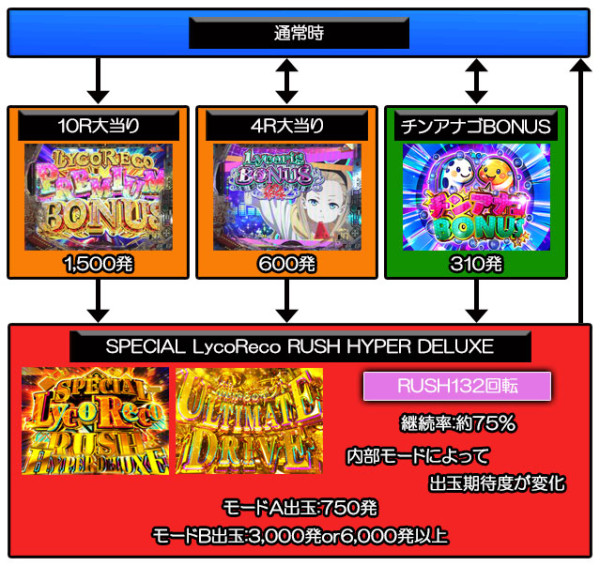 滞在中の大当り後は再びSPECIAL LycoReco RUSH HYPER DELUXEに突入する仕様で、継続率は約75%。大当り時は内部モードによって出玉が変化し、モードAなら750発、モードBなら3,000発or6,000発以上となっている。