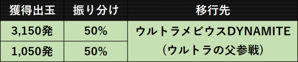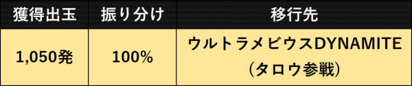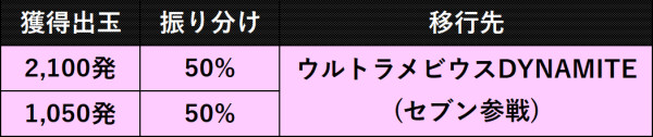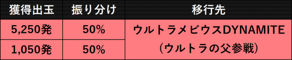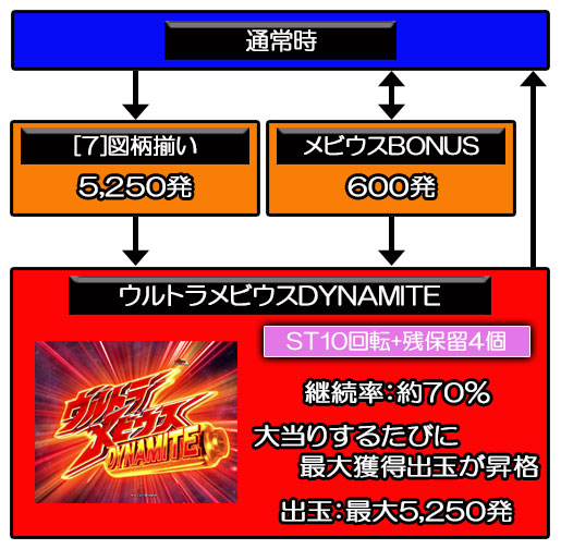 滞在中の大当り後は再びウルトラメビウスDYNAMITEへ突入する仕様で、継続率は約70%。
