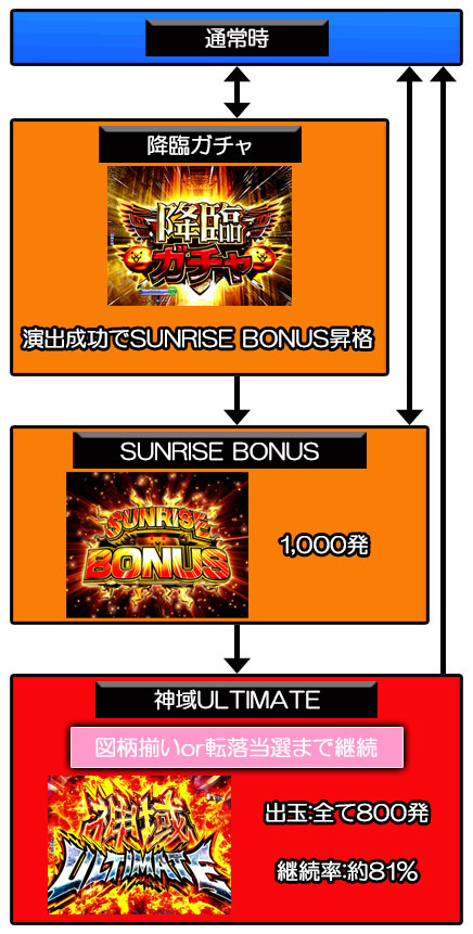 滞在中の図柄揃い(約1/26.2)後は再び神域ULTIMATEへ突入する仕様で、継続率は約81%。また、大当り時は全て800発獲得可能となっている。