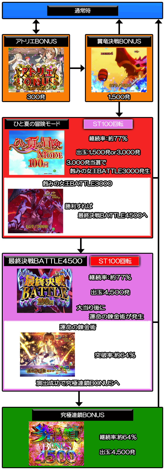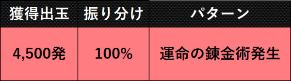4,500発獲得可能な大当りで、終了後は運命の錬金術が発生する。