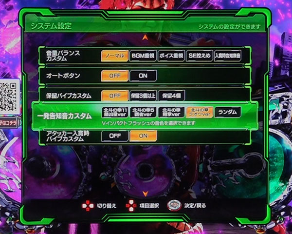 Vインパクトフラッシュの音色を「北斗の拳11 暴凶星ver」「北斗の拳5覇者ver」「北斗の拳剛掌ver」「北斗の拳ラオウver」「ランダム」から選択可能。
