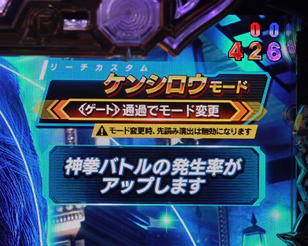 通常時のみ、神拳BATTLEの発生確率・期待度などが変化する「ノーマルモード」「ケンシロウモード」「ラオウモード」のモード変更が可能。